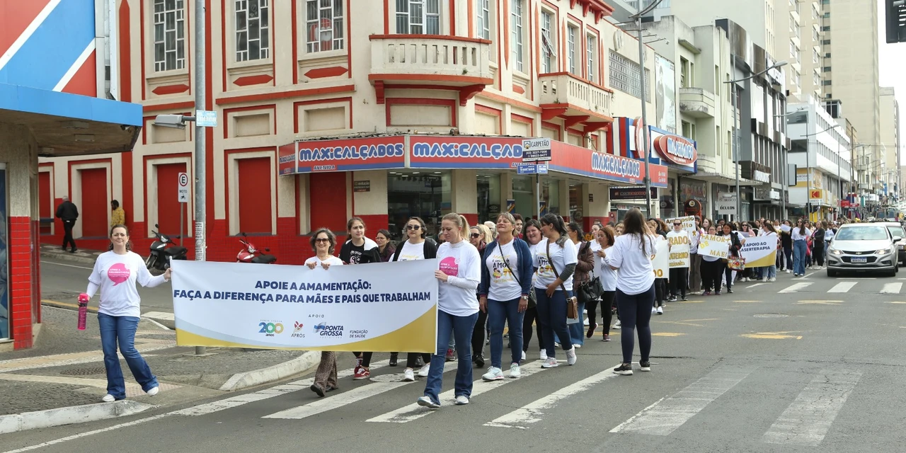 COM ASSESSORIAS - A Prefeitura de Ponta Grossa promoveu, nesta quarta-feira (29), uma caminhada sobre aleitamento materno. Com o tema da caminhada deste ano é "Possibilitando a Amamentação: Fazendo a diferença para mães e pais que trabalham", a ação reuniu mais de 400 pessoas na região central do Município.