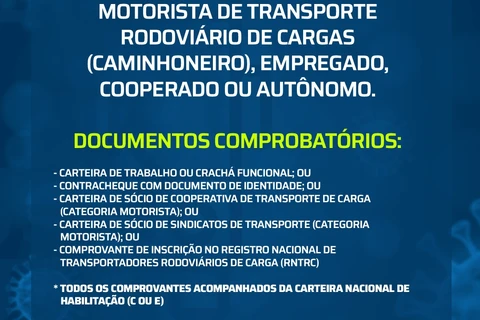 29/06/2021 - Vacinação de motoristas do transporte rodoviário de cargas (caminhoneiros) - (9h às 15h)