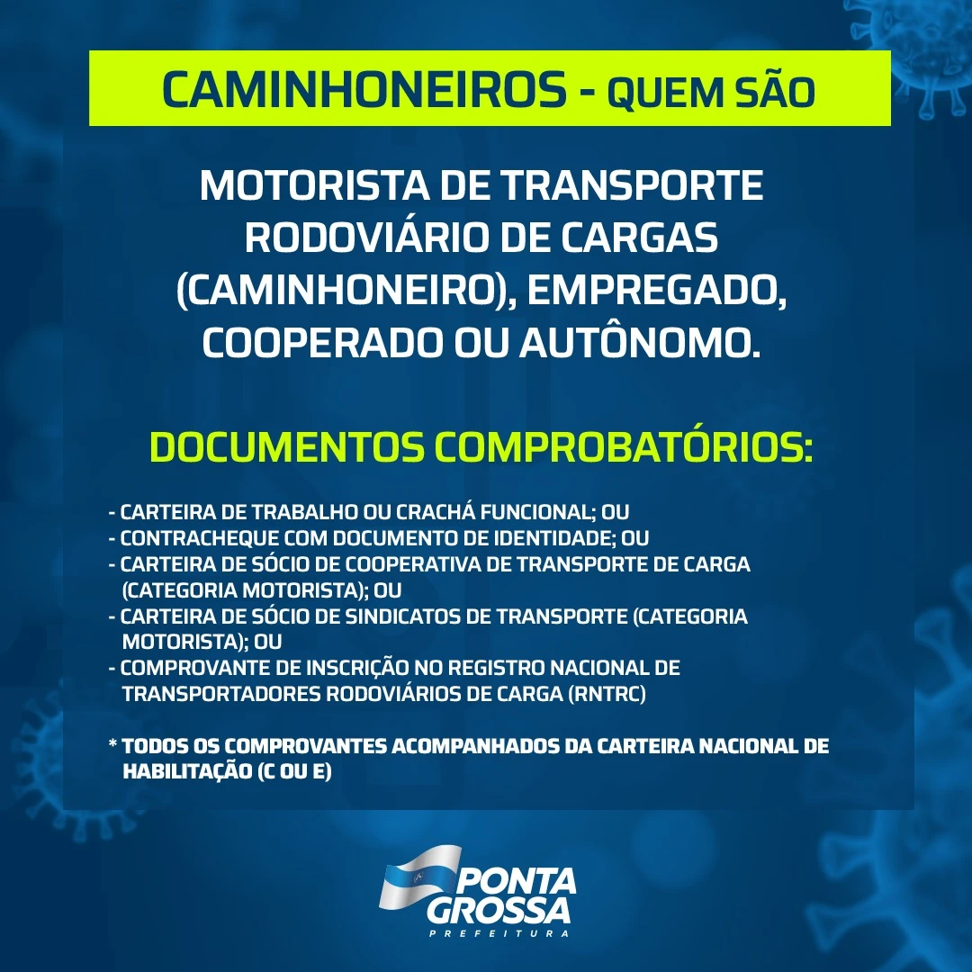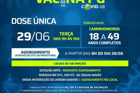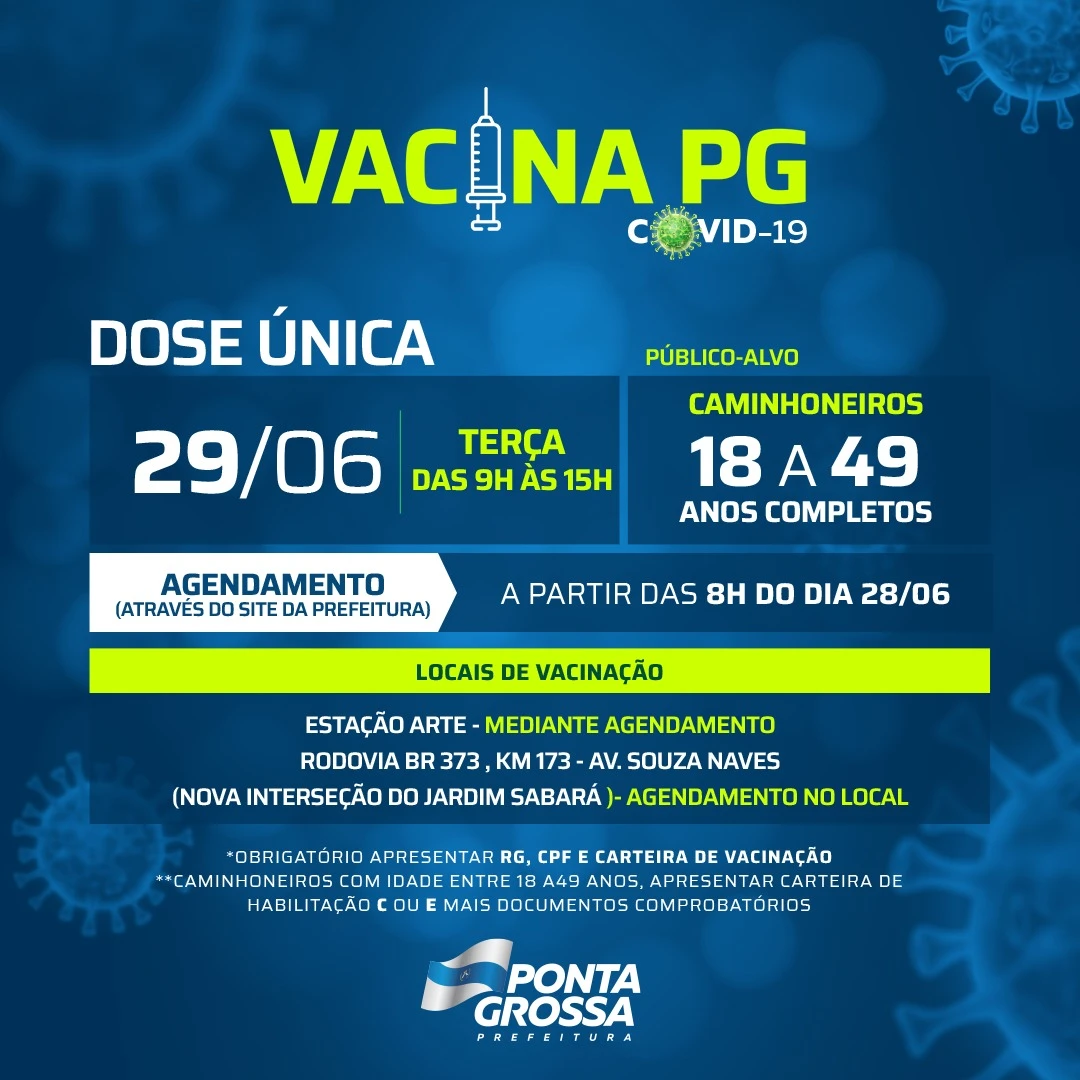 COM ASSESSORIAS - A Prefeitura de Ponta Grossa, através da Fundação Municipal de Saúde (FMS), executará uma nova etapa do cronograma de vacinação contra covid-19 nesta terça-feira (29). O público alvo desta etapa são os caminhoneiros e motoristas do transporte de cargas de 18 a 49 anos, que receberão aplicação da vacina em dose única. Esta imunização acontece das 9h às 15h na Estação Arte, mediante agendamento prévio no site, e também com uma equipe itinerante, com cadastramento na hora.