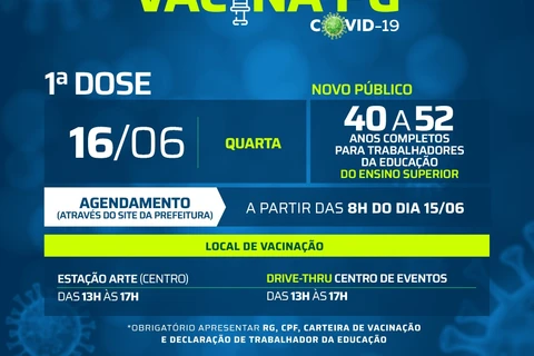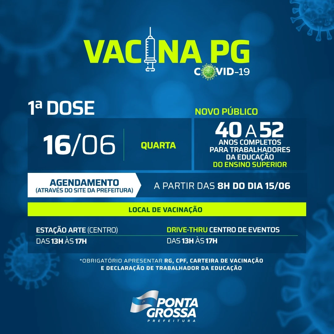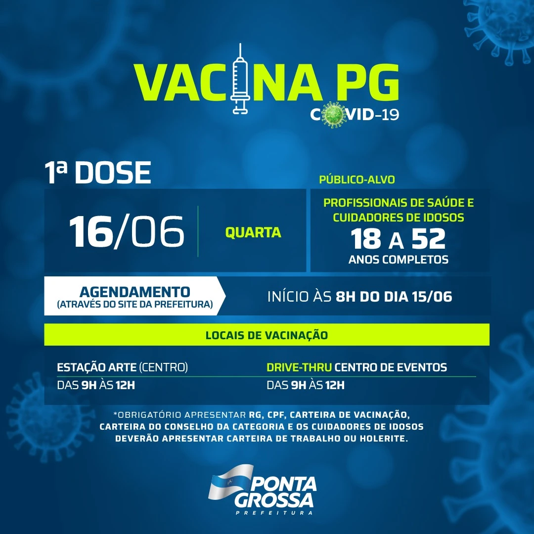 COM ASSESSORIAS - A Prefeitura de Ponta Grossa, através da Fundação Municipal de Saúde (FMS), já definiu o cronograma de vacinação para quarta-feira (16). As ações contemplam a vacinação dos profissionais da saúde e cuidadores de idosos, com idade entre 18 e 52 anos. Além deste público, a Prefeitura iniciará a vacinação exclusiva para trabalhadores da educação do Ensino Superior, com idade entre 40 e 52 anos.