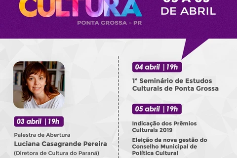 O segundo dia, 04 de abril, será dedicado à apresentação dos trabalhos selecionados para o I Seminário de Estudos Culturais de Ponta Grossa. Cada autor terá 10 minutos para apresentar a pesquisa, seguidos de mais 10 minutos para perguntas e discussão do público. No ultimo dia, 05, será a definição dos homenageados com os Prêmios Culturais 2019, seguida pelas eleições dos segmentos e novos representantes do CMPC para a gestão 2019-2021.