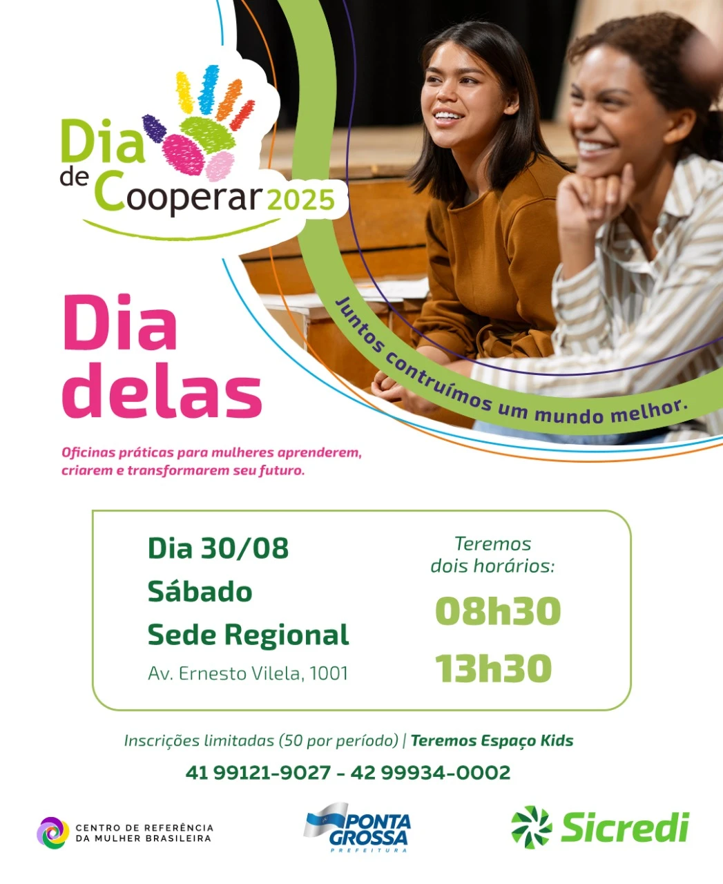 COM ASSESSORIAS - A Prefeitura de Ponta Grossa, por meio da Secretaria Municipal de Família e Desenvolvimento Social (SMFDS), em parceria com o Sicredi, promove no dia 30 de agosto o “Dia Delas”, ação integrada ao Dia de Cooperar 2025. O evento é dedicado ao fortalecimento, à valorização e à inspiração das mulheres, oferecendo oficinas práticas, orientações e atividades voltadas ao empreendedorismo e ao desenvolvimento pessoal.