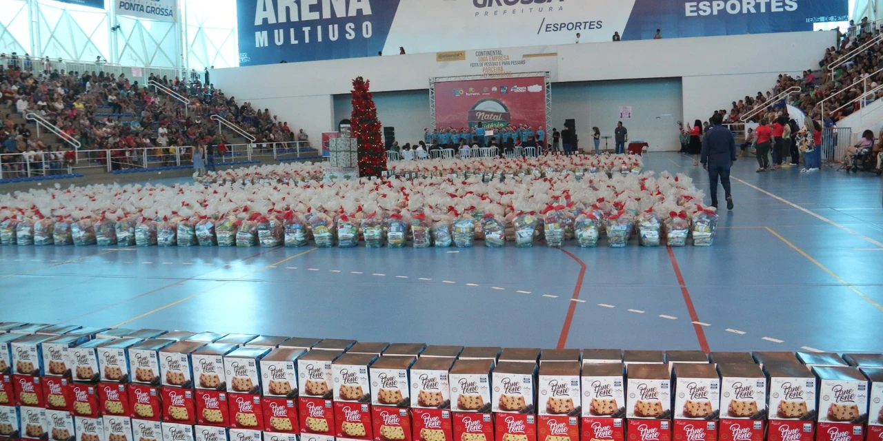 COM ASSESSORIAS - A entrega das cestas arrecadadas pela Campanha Natal Solidário 2023 foi realizada nesta quarta-feira (20), na Arena Multiuso, em Ponta Grossa. Ao todo, 1.100 famílias em situação de vulnerabilidade social, cadastradas pelos CRAS, foram beneficiadas. A campanha é uma promoção da Prefeitura de Ponta Grossa, através da Secretaria Municipal de Família e Desenvolvimento Social e Programa Selo Social, com apoio da Fundação de Assistência Social e de empresas parceiras.