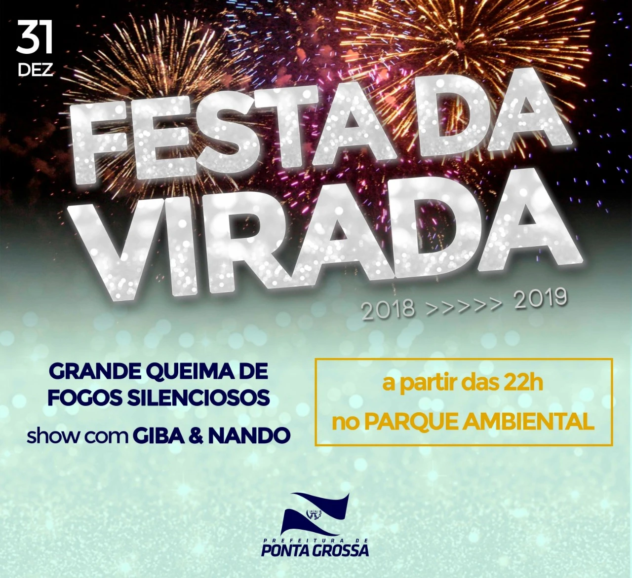 IMPRENSA/Ponta Grossa - Como acontece desde 2013, a Prefeitura de Ponta Grossa está preparando uma grande Festa da Virada no Parque Ambiental, para que os ponta-grossenses possam celebrar a chegada de 2019 em alto estilo e com muita alegria. Estão garantidos a tradicional queima de fogos silenciosos e show com a dupla Giba & Nando. A festa começa às 22h e segue até às 2h.
