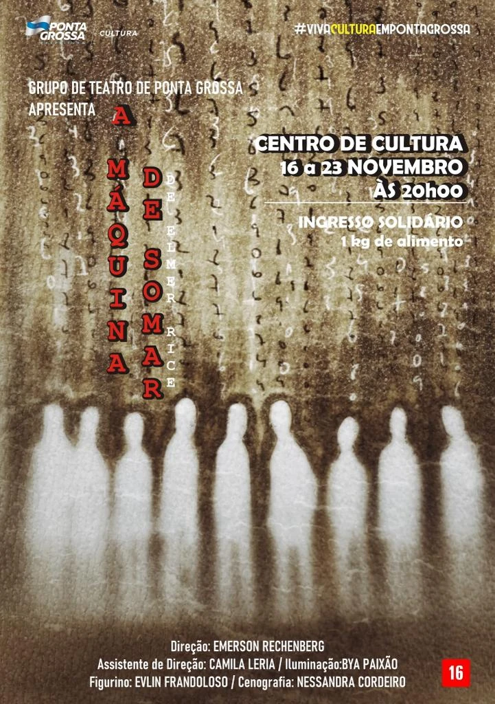 COM ASSESSORIAS - A Prefeitura de Ponta Grossa inicia, no próximo dia 16, as apresentações da peça “A máquina de Somar”. O espetáculo conta com sessões diárias realizadas às 20h no Centro de Cultura. O ingresso é um quilo de alimento que será revertido para ações sociais do Município.