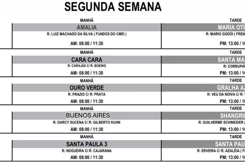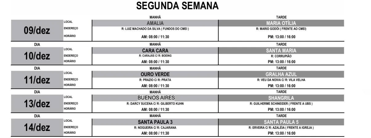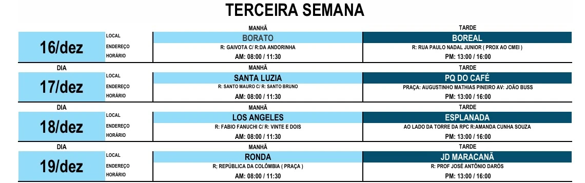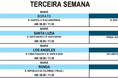 As primeiras paradas do cadastro itinerante, no dia 02 de dezembro, serão no Residencial Costa Rica (das 8h às 11h30) e no Lagoa Dourada (das 13h às 16 horas); a mesma dinâmica será realizada ao longo das próximas três semanas, de segunda a sexta, conforme cronograma divulgado abaixo.