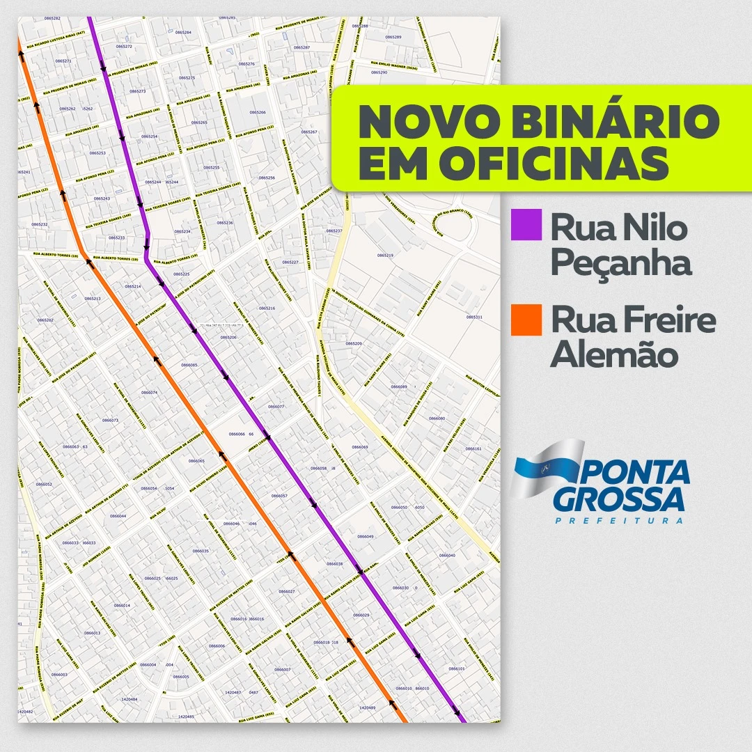 COM ASSESSORIAS - A Prefeitura de Ponta Grossa iniciou nesta sexta-feira (12) a sinalização horizontal de um novo binário no bairro Oficinas. O sistema vai abranger as ruas Nilo Peçanha e Freire Alemão. O sentido único em cada uma das vias passará a valer neste sábado (13), quando o Departamento de Engenharia de Tráfego finalizará a mudança da sinalização vertical.