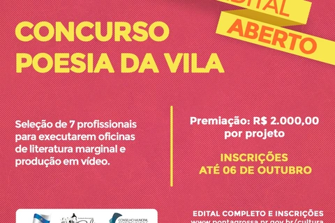 Luana Caroline Nascimento/Ponta Grossa - A Prefeitura de Ponta Grossa, por meio da Fundação Municipal de Cultura, e o Conselho Municipal de Política Cultural, atendendo às políticas culturais do Município aprovadas nas Conferências Municipais de Cultura, lançaram o Concurso Poesia da Vila, uma seletiva de apoio a oficinas de literatura marginal. O edital irá selecionar projetos voltados à literatura marginal, com oficinas que envolvam produção literária e produção audiovisual em vilas da cidade de Ponta Grossa, com a finalidade de coletar diferentes materiais em texto e em vídeo que expressem as variações da cultura nos bairros da cidade.