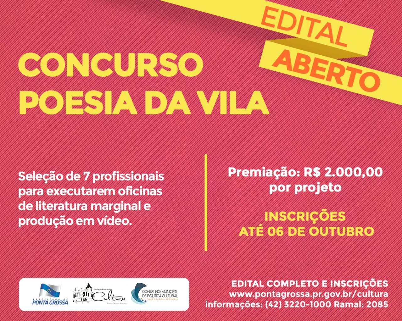 www.pontagrossa.pr.gov.br/cultura. Poderão concorrer pessoas físicas com idade mínima de 18 anos e comprovada atuação em produção de obras audiovisuais, saraus, batalhas de rima e outros segmentos relacionados à literatura marginal; e pessoas jurídicas, no caso de grupos, ONGs, cooperativas ou microempreendedores individuais, com sede no município de Ponta Grossa há pelo menos um ano.