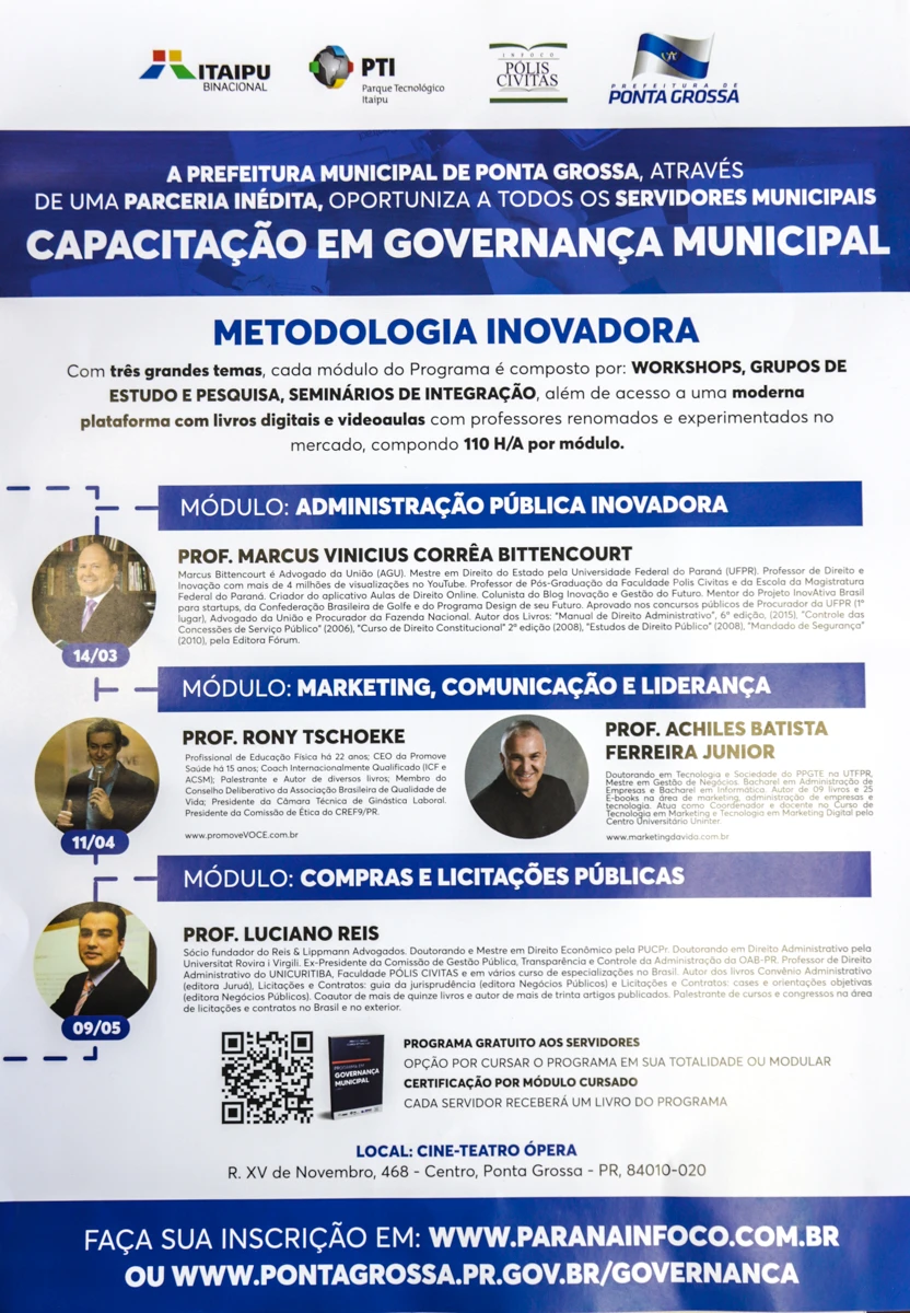 Gustavo Ban/Ponta Grossa - Por que não fazer de Ponta Grossa a cidade paranaense com o maior número de servidores capacitados? Esse é o objetivo do curso de “Capacitação em Governança Municipal”, uma parceria inédita entre a Prefeitura Municipal de Ponta Grossa, Itaipu Binacional, Parque Tecnológico Itaipu (PTI) e Pólis Civita, apresentado na manhã desta quinta-feira (07).