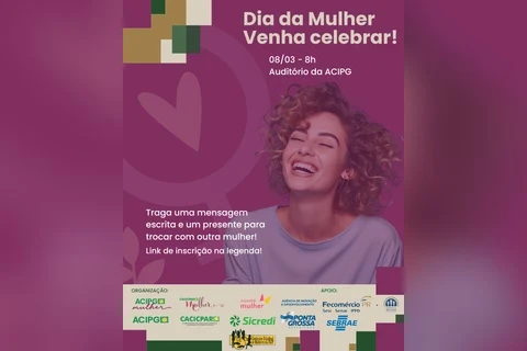 Realização:O evento de Dia da Mulher está sendo organizado pela Associação Comercial, Industrial e Empresarial de Ponta Grossa (ACIPG), ACIPG Mulher, Coordenadoria das Associações Comerciais e Empresariais do Centro do Paraná (CACICPAR), CACICPAR Mulher, Comitê Mulher, Sicredi, Comissão Estadual de Mulheres da FAEP e com apoio da Prefeitura de Ponta Grossa através da Agência de Inovação e Desenvolvimento, SEBRAE, Fecomércio Paraná e Câmara da Mulher Empreendedora e Gestora de Negócios.