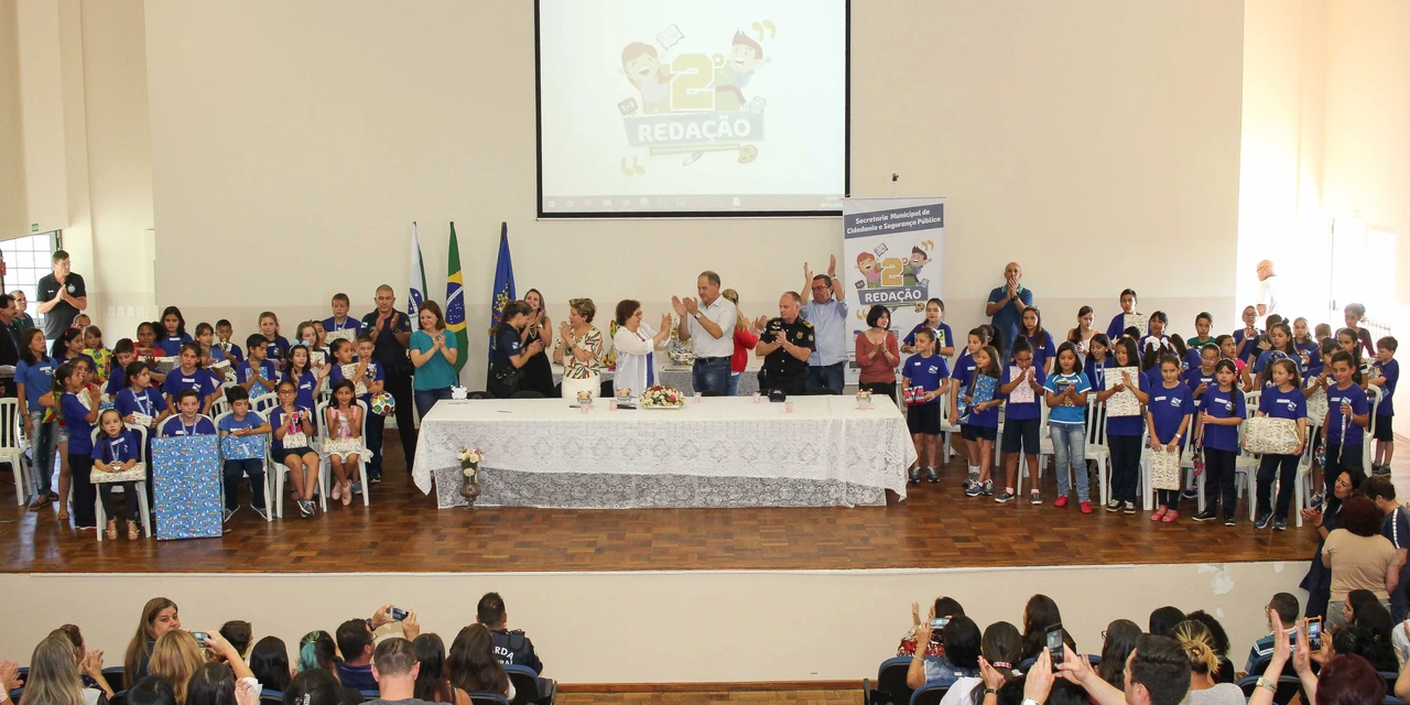 IMPRENSA/Ponta Grossa - A Prefeitura de Ponta Grossa, através da Secretaria Municipal de Cidadania e Segurança Pública (SMCSP) e a Secretaria Municipal de Educação (SME) promoveu, na última semana, a premiação do segundo Concurso Anual de Redação da SMCSP. Com mais de quatro mil participantes, a competição deste ano trouxe o tema “Família”. Sessenta e cinco crianças tiveram seus textos selecionados para a premiação, que contou com a presença da vice-prefeita Elizabeth Schmidt e dos secretários municipais Ary Lovato (SMCSP) e Esméria de Lourdes Saveli.