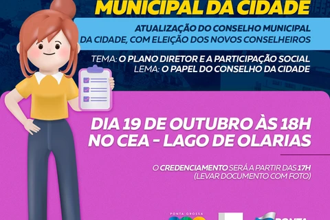 Durante o encontro, o Município irá eleger novos membros do Conselho da Cidade. Também será realizada uma palestra sobre a importância da participação popular através do Conselho no acompanhamento do Plano Diretor em vigência e de suas atualizações