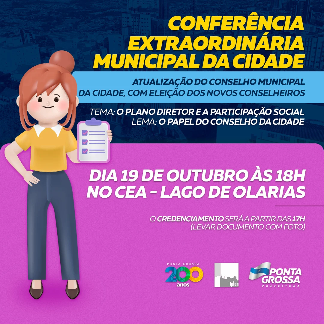 COM ASSESSORIAS - A Prefeitura de Ponta Grossa, através do Instituto de Pesquisa e Planejamento Urbano (Iplan), promove, no dia 19 de outubro, a Conferência Extraordinária Municipal da Cidade. O evento acontece a partir das 17h no Centro de Educação Ambiental do Parque Lago de Olarias.