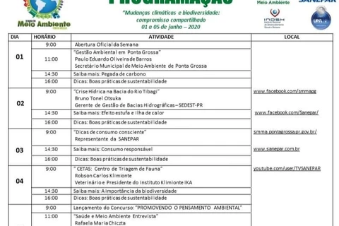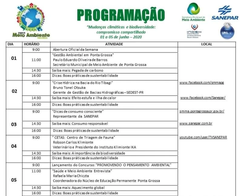 A Semana de Meio Ambiente é uma realização da Prefeitura de Ponta Grossa, Secretaria de Meio Ambiente e Companhia de Saneamento do Paraná (Sanepar), com apoio do Instituto Nacional de Desenvolvimento Social e Humano (INDSH) e da UPA 24 horas. A programação desta terça-feira (02) inicia com publicação às 9h sobre a crise hídrica na bacia do Rio Tibagi. Os conteúdos continuarão disponíveis na página posteriormente. >
