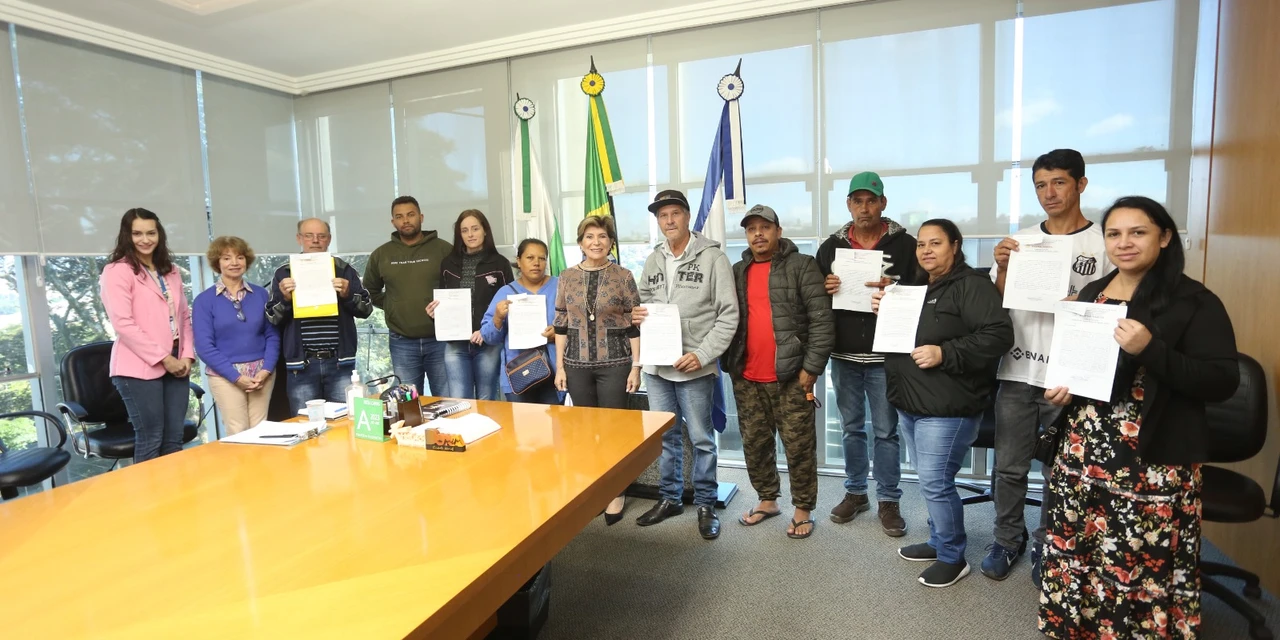 COM ASSESSORIAS - Famílias que moram no Ouro Verde, Bela Vista, Jardim Nossa Senhora das Graças, Vila Nova II e Santa Terezinha receberam nesta quinta-feira (27), das mãos da prefeita Elizabeth Schmidt, os Termos de Quitação de seus imóveis. A regularização foi possível graças ao Programa "Papel Legal", desenvolvido pela prefeitura de Ponta Grossa.