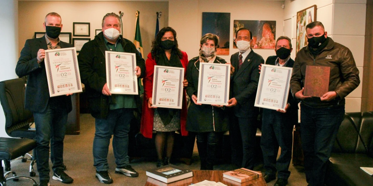 IMPRENSA/Ponta Grossa - Na tarde desta quinta-feira (04), o prefeito de Ponta Grossa, Marcelo Rangel; a vice-prefeita Elizabeth Schmidt e o secretário de Indústria, Comércio e Qualificação Profissional (SMICQP), José Loureiro, receberam uma honra ao mérito do presidente da Câmara do Comércio e Indústria Brasil-Coreia (CCIBK), Dr. Hong Soon Kang, pela contribuição na 3ª Copa Embaixador da República da Coreia de Taekwondo, realizada em novembro de 2019, em Curitiba.