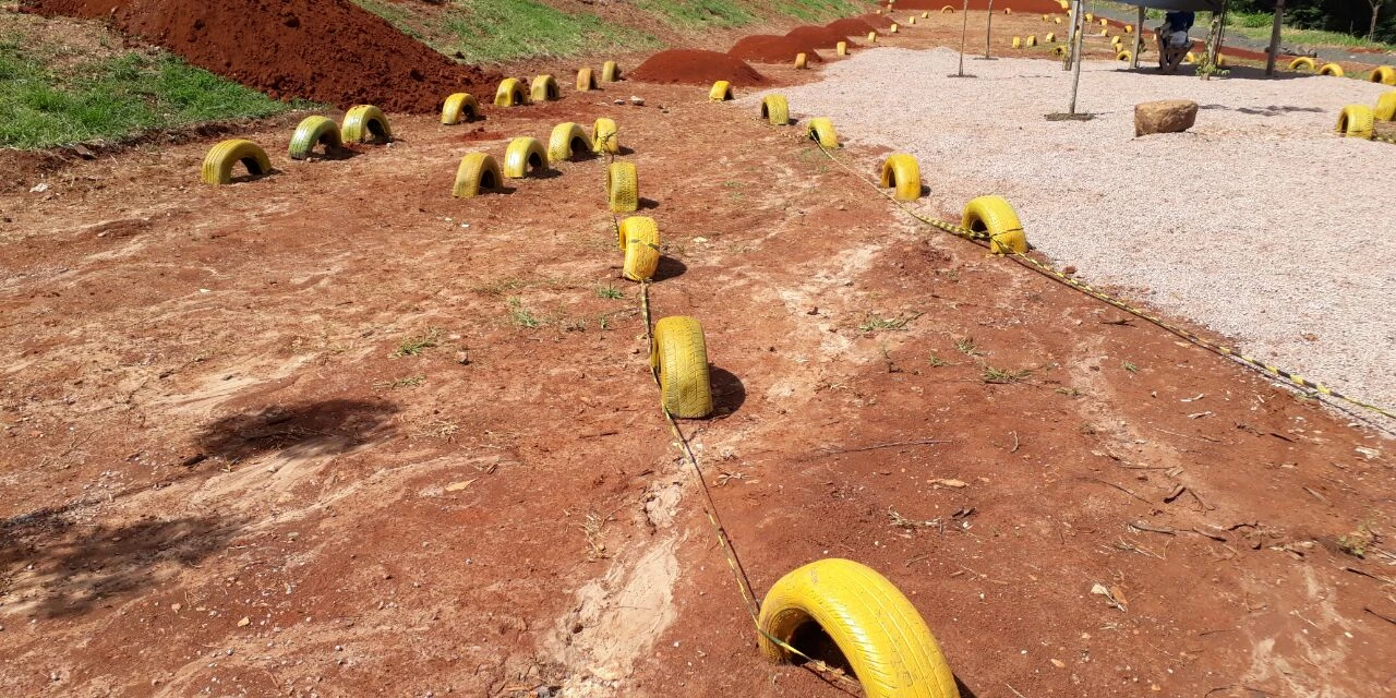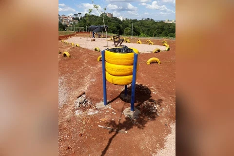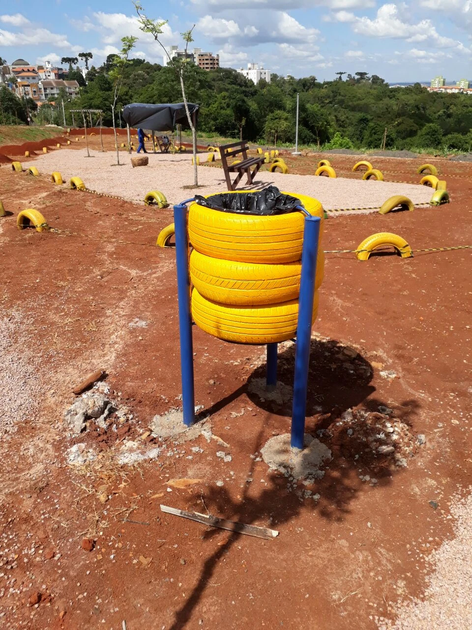 IMPRENSA/Ponta Grossa - Como forma de economia e sustentabilidade, a Secretaria de Serviços Públicos inovou na construção da praça Maria Joana, espaço de lazer localizado na rua Visconde de Nacar que está em fase de conclusão e deve ser inaugurado nos próximos dias. Ideia sugerida pelo servidor municipal Vanderlei Vieira, foram utilizados 150 pneus resgatados de arroios para a confecção de cinco lixeiras e de uma pista de bicicross infantil.