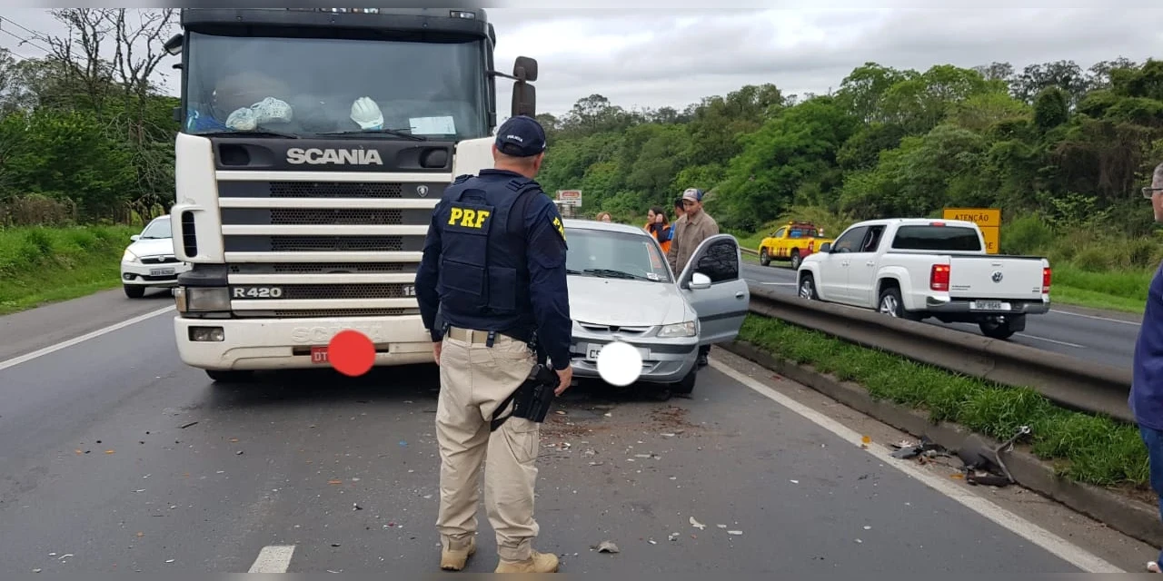 BDCOM/3° Delegacia da PRF/Ponta Grossa - A PRF atendeu por volta das 14h40 de hoje (11), no quilômetro 496 da BR 376, em Ponta Grossa, a um acidente com múltiplas colisões.