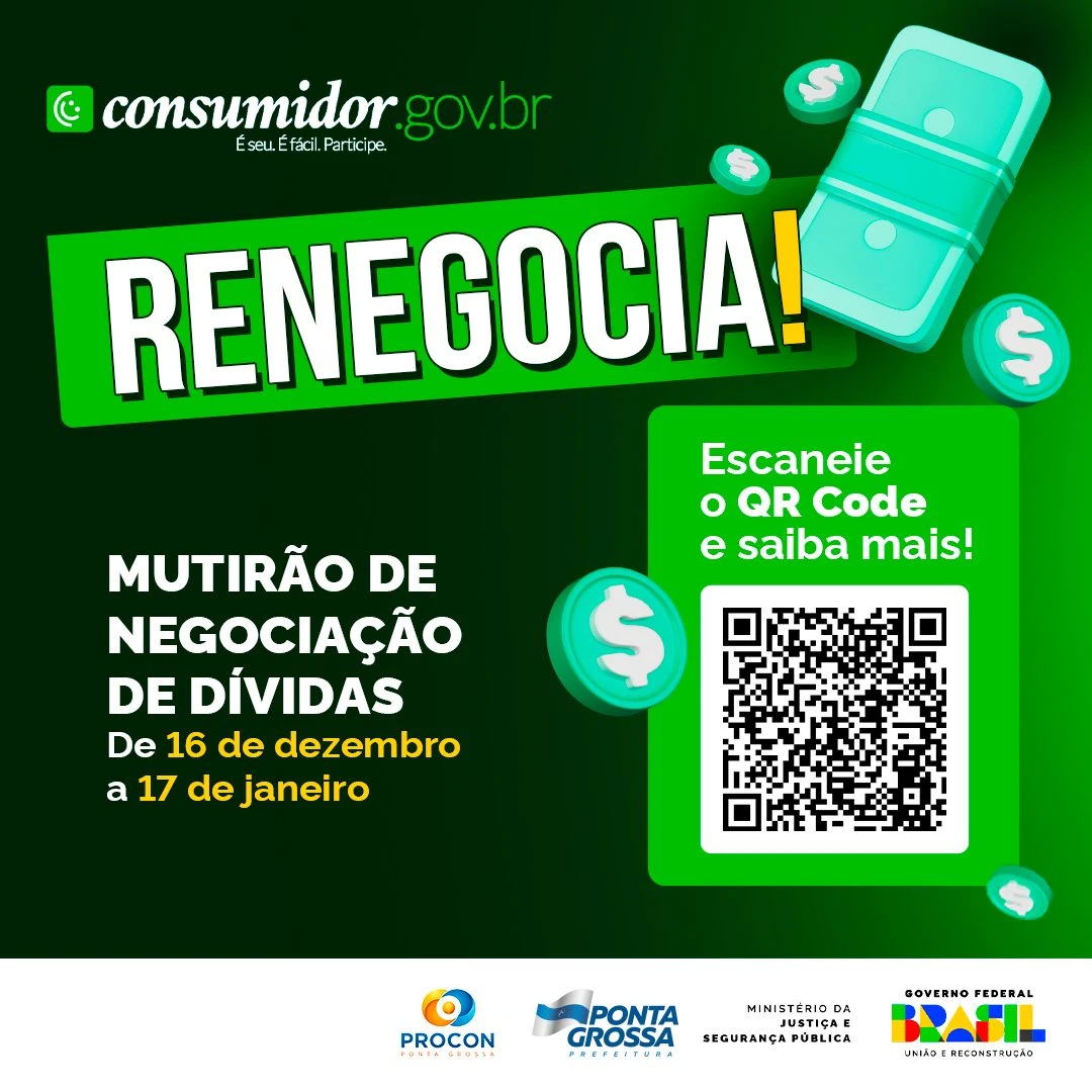COM ASSESSORIAS - O Procon da Prefeitura de Ponta Grossa inicia nesta segunda-feira (16) as ações da segunda edição do "Mutirão Renegocia!". A iniciativa, coordenada pela Secretaria Nacional do Consumidor (Senacon), do Ministério de Justiça e Segurança Pública, possibilita a negociação de dívidas online, através da plataforma