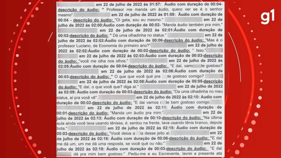 De acordo com o relatório final do processo, ao qual o g1 teve acesso, o docente cometeu o assédio sexual em julho de 2022, por meio de mensagens escritas, áudios e vídeos.