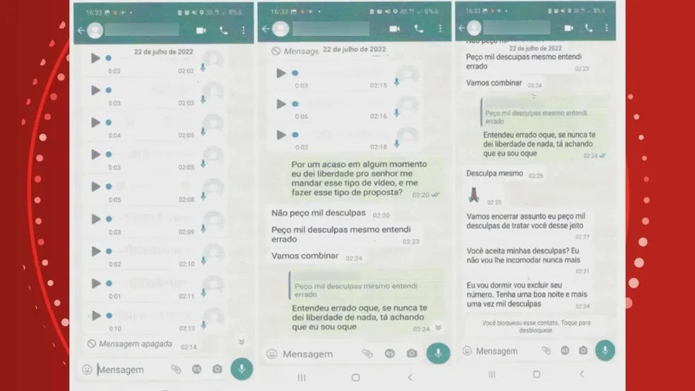 Veja, abaixo, os prints das mensagens e as transcrições dos áudios. Os números dos celulares e palavras com tom pejorativo foram borrados: