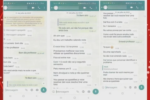 Depois, ele disse que ela tirou nota baixa em um trabalho e ofereceu a possibilidade de a acadêmica refazê-lo. Afirmou, também, que poderia passar as questões via WhatsApp.