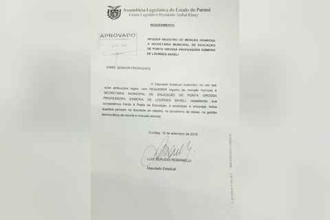 No texto da proposta, o deputado afirma requerer o registro da Menção Honrosa à secretária de Educação de Ponta Grossa por "sua competência frente à Pasta da Educação, a enobrecer e encorajar todos quantos pensam na liberdade de cátedra, no pluralismo de ideias, na gestão democrática da escola e inclusão escolar". A Menção foi realizada no mesmo dia da rejeição ao projeto conhecido como "escola sem partido", também na ALEP.