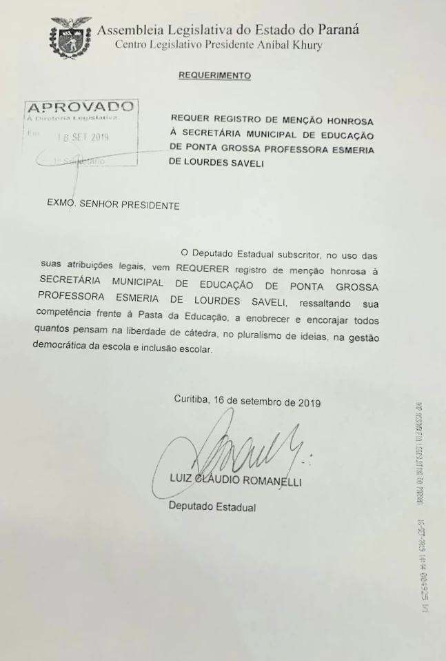 IMPRENSA/Ponta Grossa - A secretária de Educação de Ponta Grossa, professora Esméria de Lourdes Saveli, recebeu nesta terça-feira uma Menção Honrosa aprovada pela Assembleia Legislativa do Estado do Paraná. A proposta, que é um instrumento oficial da ALEP para o reconhecimento a cidadãos por práticas que beneficiam a sociedade paranaense, foi feita pelo deputado estadual Luiz Cláudio Romanelli e aprovada na segunda-feira.