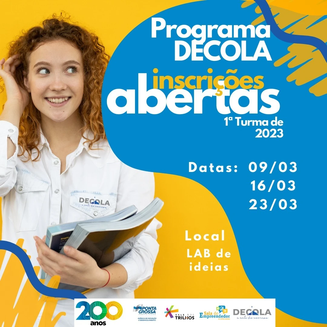 COM ASSESSORIAS - Estão abertas as inscrições para a 13ª turma do Programa Decola, iniciativa da Prefeitura de Ponta Grossa através do projeto Vale dos Trilhos, por meio da Agência de Inovação e Desenvolvimento.