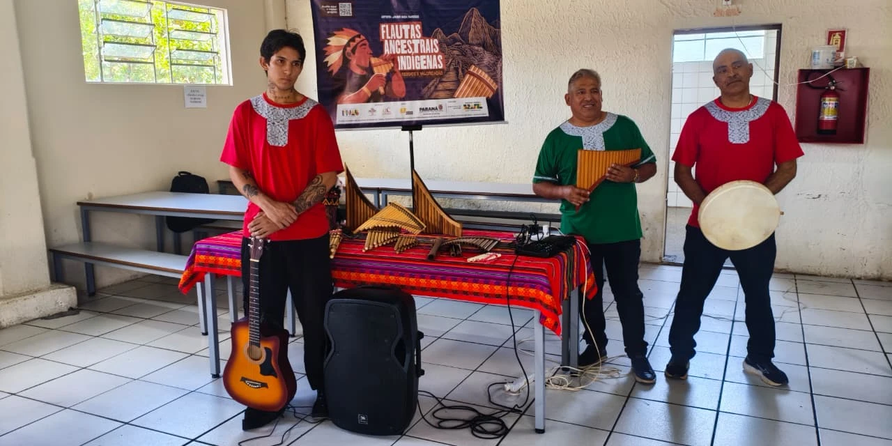 COM ASSESSORIAS - O som das flautas ancestrais transportou os alunos do Colégio Cívico-Militar Professor Becker e Silva para as montanhas geladas dos Andes. Na última segunda-feira (6), eles participaram do projeto “Flautas Ancestrais Indígenas: resgate e valorização”, idealizado pelo músico e professor Luís Javier Paredes Reategui, e puderam conhecer um pouco mais sobre as tradições e a cultura inca. A iniciativa está promovendo apresentações musicais e oficinas para confecção de panflute em dez municípios dos Campos Gerais, mostrando a riqueza e diversidade dos povos originários. O projeto é viabilizado pela Secretaria de Estado da Cultura do Paraná através de recursos da Política Nacional Aldir Blanc de Fomento à Cultura do Ministério da Cultura (Governo Federal) e conta com a produção executiva da Dali Projetos Criativos e da ABC Projetos Culturais.