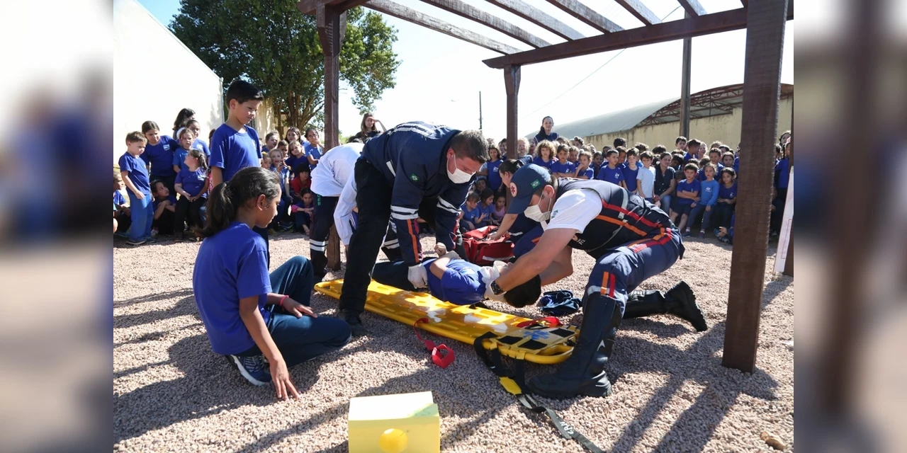 IMPRENSA/Ponta Grossa - O projeto ‘Samu Escola: Educar para mudar’ realizou mais um treinamento na tarde desta segunda-feira (22), desta vez foi na Escola Municipal Zilá Bernadete, na Vila Dom Bosco. A atividade aconteceu das 14h às 16h. Houve palestras sobre desobstrução de vias áreas, trotes e sobre Educação no Trânsito, para finalizar ocorreu um simulado de queda de altura e de convulsão. A ação foi realizada em parceria entre as secretarias de Saúde e Educação, através do Samu e do Departamento de Saúde na Escola.