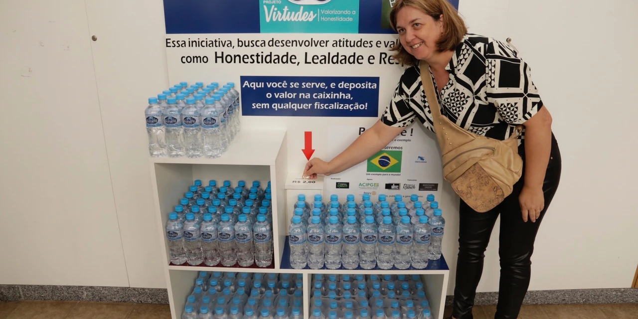 IMPRENSA/Ponta Grossa - A Prefeitura de Ponta Grossa, através da Secretaria Municipal de Administração e Recursos Humanos (SMARH) e Secretaria Municipal de Governo (SMG), iniciou esta semana mais uma edição do Projeto Virtudes – Valorizando a Honestidade. Dessa vez em parceria com a empresa Royal Fit, um stand com garrafas de água foi montado na Praça de Atendimento com a oferta de garrafas de 500ml de água pelo valor de R$ 2, mas sem qualquer fiscalização. A proposta é estimular a conscientização da população, com valores como honestidade e respeito.