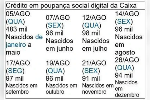 A portaria diz ainda que nas datas indicadas nesse calendário, os recursos estarão disponíveis apenas para o pagamento de contas, de boletos e para realização de compras por meio de cartão de débito virtual ou QR Code.