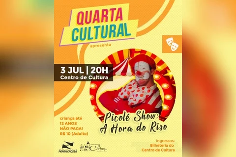 Luana Caroline Nascimento/Ponta Grossa - A alegria e as estripulias do Palhaço Picolé tomarão conta do Centro de Cultura na próxima semana. O espetáculo ‘Picolé Show: A Hora do Riso’ será apresentado no dia 03 de julho, às 20h. Os ingressos custam R$ 10 (preço promocional) e crianças não pagam entrada. O show integra a agenda do Quarta Cultural, projeto realizado pela Prefeitura de Ponta Grossa, por meio da Fundação Municipal de Cultura.