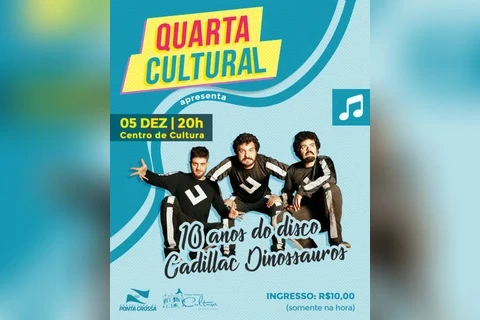 Luana Caroline Nascimento/Ponta Grossa - Nesta quarta-feira, 05, a banda ponta-grossense Cadillac Dinossauros irá se apresentar no projeto Quarta Cultural, desenvolvido pela Prefeitura de Ponta Grossa, por meio da Fundação Municipal de Cultura. O show será às 20h, no Centro de Cultura, com ingressos que serão vendidos a R$ 10.