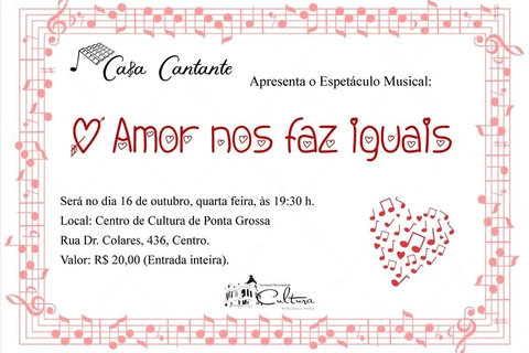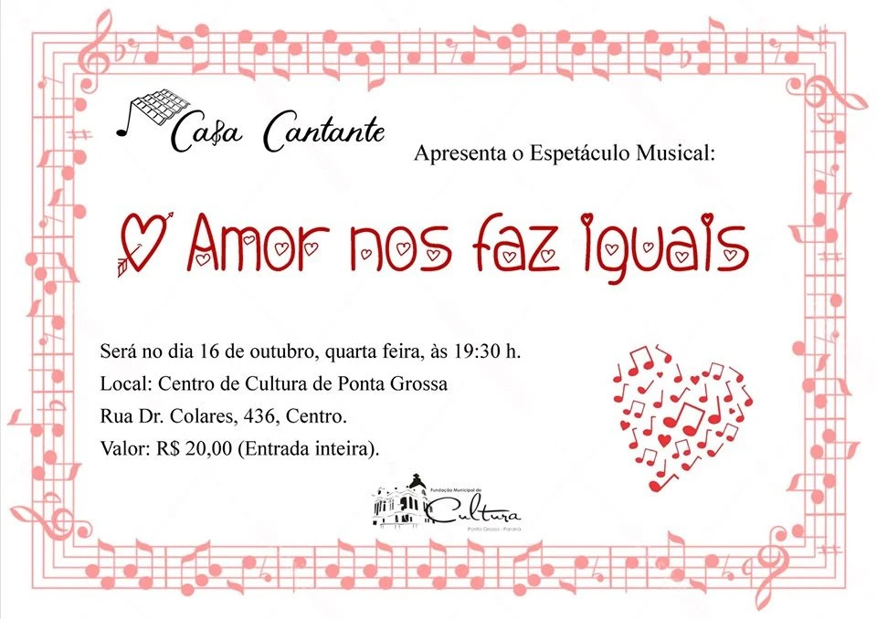 Luana Caroline Nascimento/Ponta Grossa - Na próxima quarta-feira, 16 de outubro, o Projeto Quarta Cultural irá receber os alunos da Escola de Música Casa Cantante para uma apresentação temática dos anos 80. O espetáculo musical ‘O amor nos faz iguais’ será no Centro de Cultura e Inovação, às 19h30. Os ingressos custam R$ 20 (inteira) e R$ 10 (meia-entrada e solidário, mediante a doação de um litro de leite).