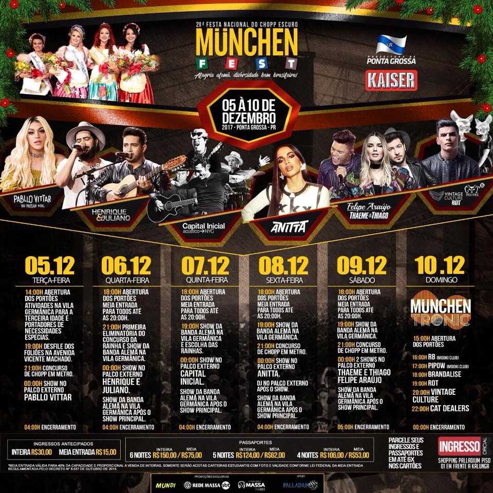 O prefeito de Ponta Grossa, Marcelo Rangel, divulgou na tarde de hoje em coletiva de imprensa realizada na prefeitura municipal, a agenda de shows da 28ª Festa Nacional do Chopp Escuro, a tradicional München Fest, que nesse ano terá seis dias de apresentações artísticas com nomes de destaque do cenário musical nacional da atualidade, entre os dias 5 e 10 de dezembro.
