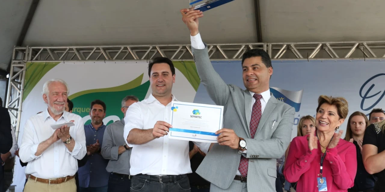 IMPRENSA/Ponta Grossa - O Parque Ecotecnológio Professor Sérgio Escorsim foi oficialmente inaugurado na tarde desta quarta-feira (23). A solenidade aconteceu durante as atividades que marcam a instalação da sede do Governo do Estado em Ponta Grossa. Na ocasião, foram apresentadas as benfeitorias do parque, assinadas as doações de terrenos previstas para as instituições implantarem negócios relacionados à inovação e a entrega da pré-credenciamento junto ao Sistema Estadual de Parques Tecnológicos (SEPARTEC).