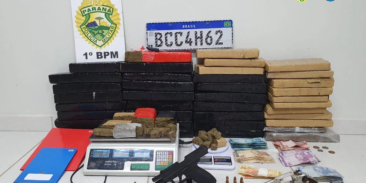 Os policiais seguiram até a casa do homem abordado e localizaram uma pistola calibre 9mm, um revólver calibre 32, nove munições calibre 9mm, quatro munições calibre 32, dinheiro e 33 quilos de maconha.