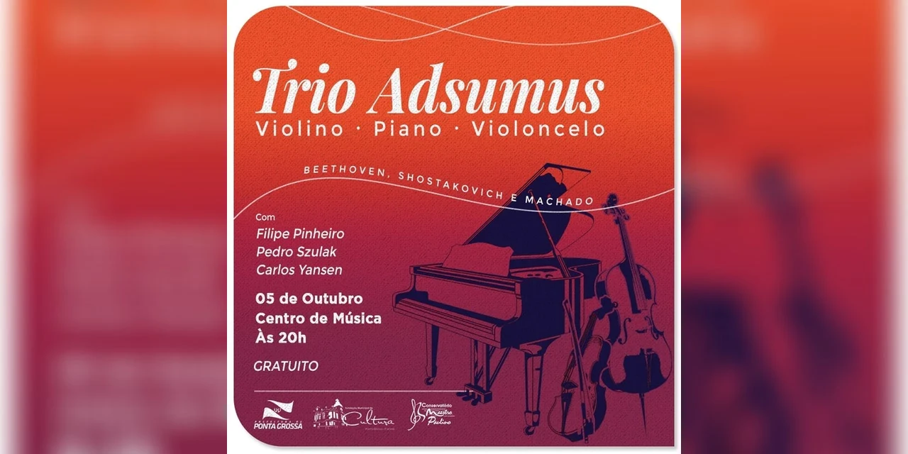 Luana Caroline Nascimento/Ponta Grossa - Nesta sexta-feira, 05 de outubro, o Centro de Música recebe o Trio Adsumus, composto por Filipe Pinheiro (violino), Pedro Szulak (violoncelo) e Carlos Yansen (piano). A apresentação será às 20h, com entrada gratuita. No repertório estará peças de Beethoven, Shostakovich e do ponta-grossense Gabriel de Paula Machado. O recital tem o apoio da Prefeitura de Ponta Grossa, por meio da Fundação Municipal de Cultura.