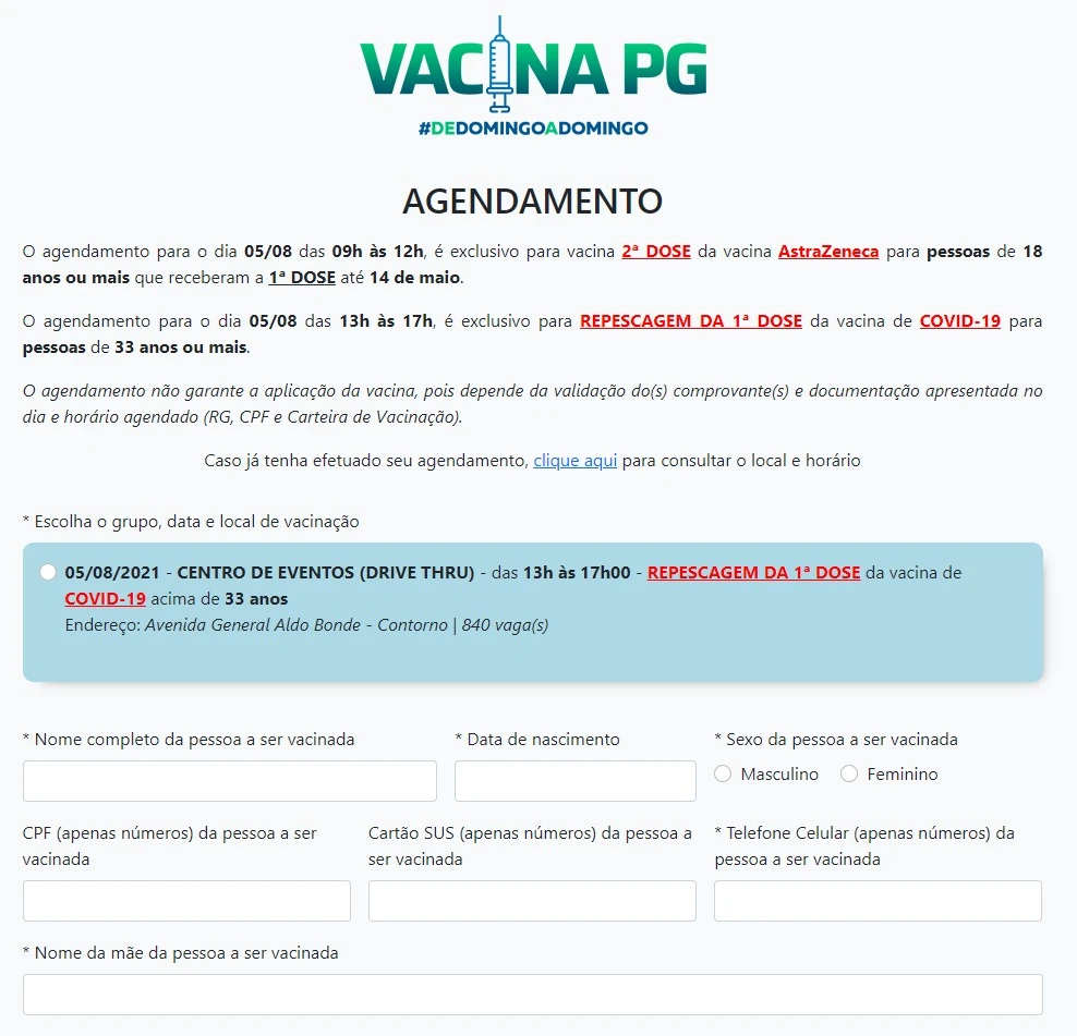 https://www.pontagrossa.pr.gov.br/). A imunização também será realizada das 13h às 17h, no Drive Thru do Centro de Eventos.