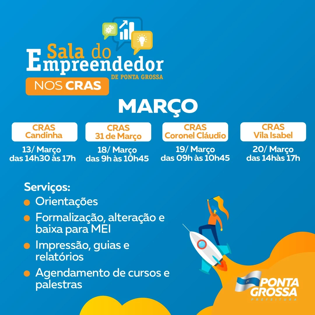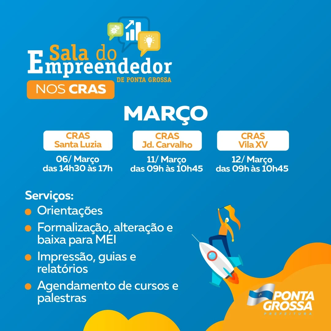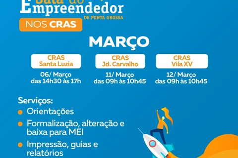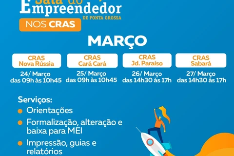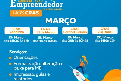 COM ASSESSORIAS - A Sala do Empreendedor divulgou o cronograma de atendimentos nos CRAS para o mês de março/2025. As datas e horários já estão definidos. Entre os serviços oferecidos estão orientações, formalização, alteração e baixa para MEI, impressão de guias e relatórios, além de agendamento de cursos e palestras.