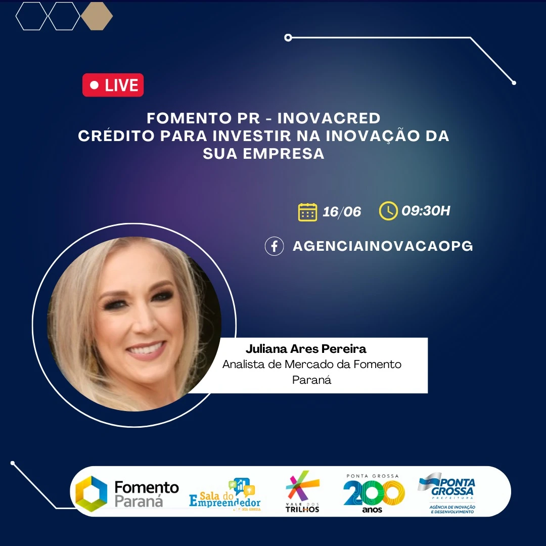 O objetivo da Live é apresentar a linha de crédito específica da inovação dos empresários locais. Durante a live, serão abordados assuntos de como investir na inovação de sua empresa. Empreendedores poderão tirar dúvidas de como funciona a linha de crédito, como solicitá-la e de que maneira utilizar para impulsionar a sua empresa.