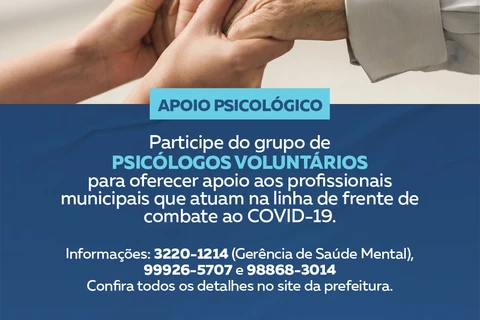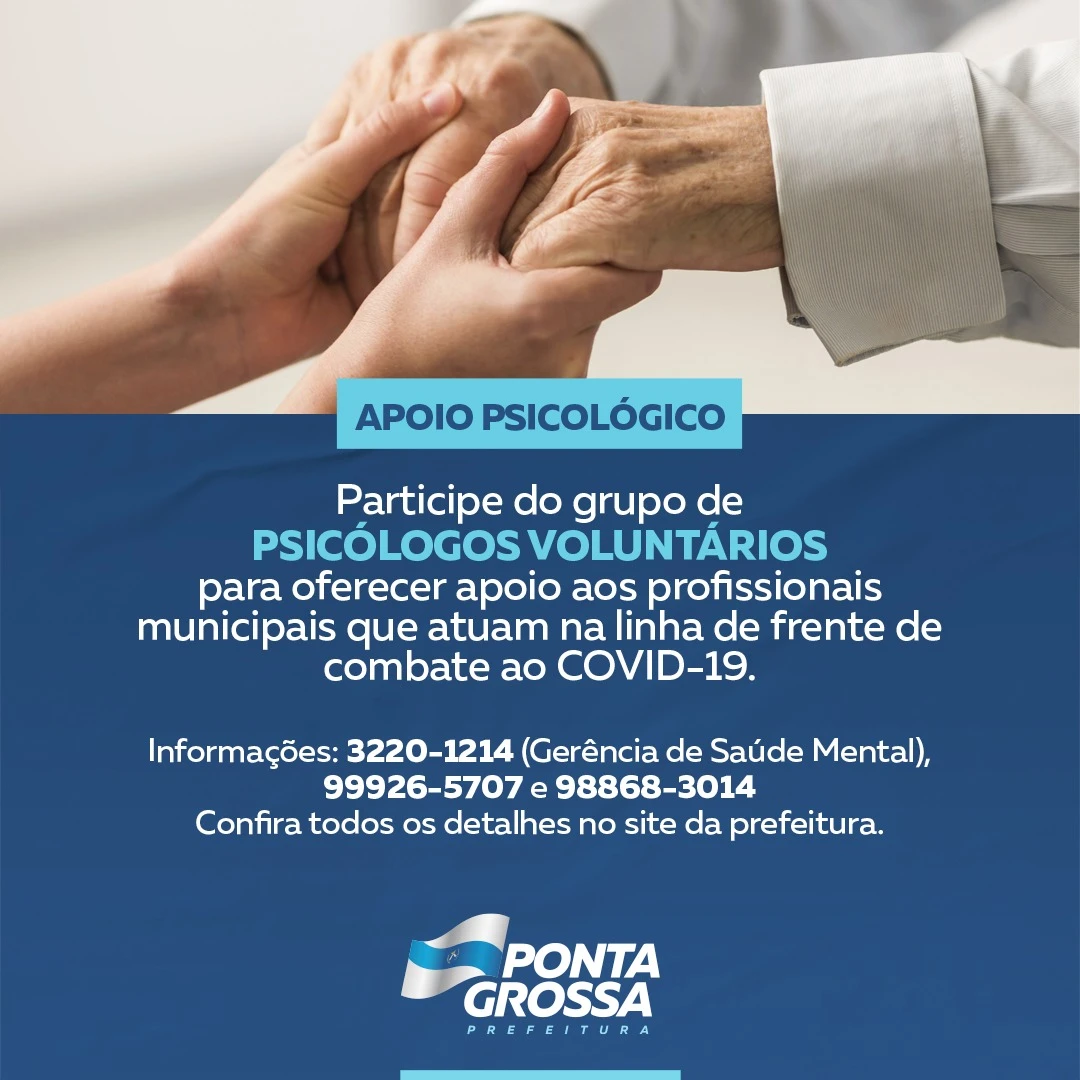 COM ASSESSORIAS - A Prefeitura de Ponta Grossa, através da Fundação Municipal de Saúde (FMS) e da Gerência de Saúde Mental, está organizando um grupo de profissionais voluntários na área da psicologia para oferecer apoio psicológico aos profissionais de saúde, servidores municipais, que atuam na linha de frente de combate a COVID-19. O objetivo é manejar e minimizar o sofrimento que está sendo vivenciado por esses profissionais, prevenindo possíveis agravos futuros à sua saúde mental.