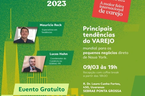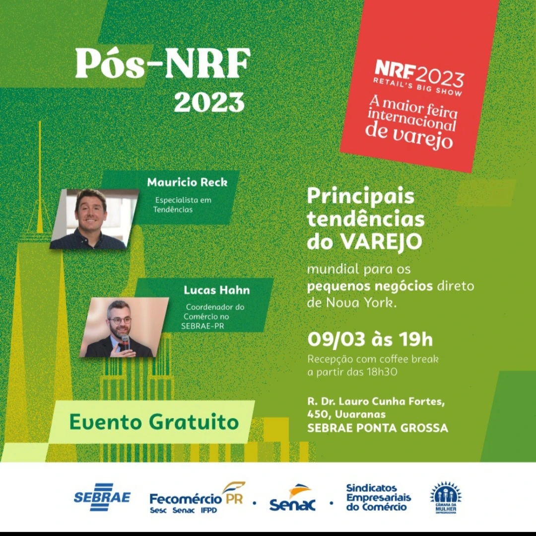 COM ASSESSORIAS - No dia 9 de março, quinta-feira, às 19h, a Regional Centro do Sebrae/PR sedia a palestra do Pós-NRF 2023, com análises da edição deste ano promovida pela National Retail Federation (NRF), considerada a maior feira de varejo do mundo. Realizada no mês de janeiro, em Nova York, nos Estados Unidos, a NRF atraiu mais de mil expositores e 350 palestrantes. O evento gratuito é voltado aos empresários de micro e pequenas empresas do comércio varejista. As vagas são limitadas e a inscrição deve ser realizada até o dia 6 de março.