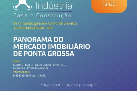 COM ASSESSORIAS - Nesta quarta-feira (29), às 18h30, será realizada na Regional Centro do Sebrae/PR, em Ponta Grossa, a apresentação do panorama do mercado imobiliário da cidade. A iniciativa conta com o apoio da Governança da Construção Civil e do Valle dos Trilhos. Serão apresentados estudos da oferta do setor, com o que existe de imóveis disponíveis no momento, e uma projeção até 2028, além da demanda na cidade, com dados do comportamento do comprador, perfil, renda socioeconômica, idade, entre outros.