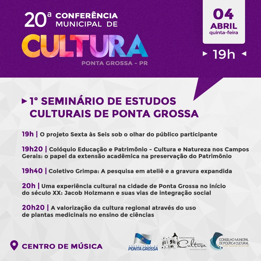 O objetivo do I Seminário de Estudos Culturais de Ponta Grossa é conhecer, discutir e compartilhar pesquisas relacionadas ao campo da cultura na cidade. Os trabalhos foram selecionados por uma comissão técnica formada por mestres e doutores integrantes do Conselho Municipal de Política Cultural, em diversas áreas do conhecimento ligadas à cultura.