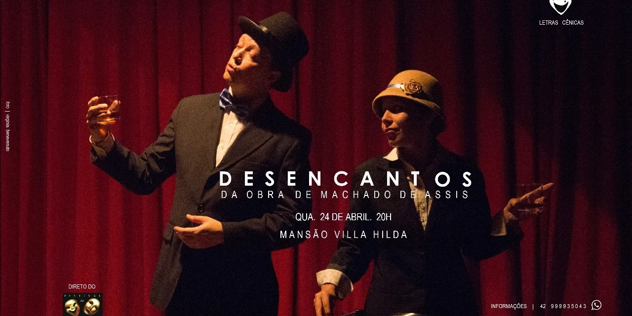 Com texto de Machado de Assis, ‘Desencantos’, do Grupo Letras Cênicas, esteve na programação do Festival de Teatro de Curitiba deste ano, o mais importante festival de teatro do país. A peça conta a história de Dona Clara, que entende bem dos jogos amorosos de salão. Após sua viuvez, ela experimenta aventuras até se decidir entre um casamento farto ou um delírio de amor promissor. Luiz de Mello é um rapaz acostumado com cantos melódicos, modo oposto do comportamento de seu rival, Pedro Alves. Entre dardos jocosos de sátira e paixão, como num afinado terceto de cordas, três figuras clássicas misturam suas ideologias numa disputa onde ninguém sairá ileso e os costumes de uma época exalam o perfume nobre de vingança e flertes dos saraus do fim do século 19. A adaptação e direção é de Carlos Alexandre de Andrade, que também está no elenco ao lado de Bya Paixão e Jocemar Chagas.