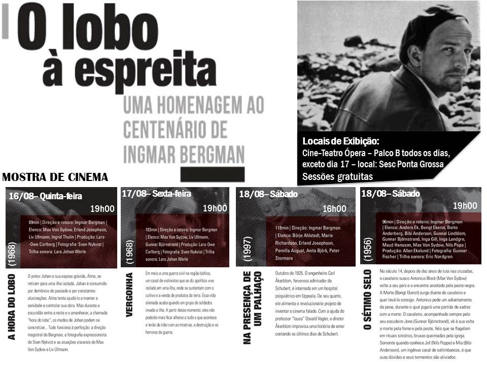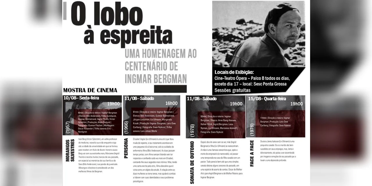 A mostra é denominada ‘O Lobo à Espreita’ e cada exibição será seguida de um debate. Neste final de semana serão apresentadas três obras, no auditório B do Cine-Teatro Ópera. O primeiro filme exibido será ‘Morangos Silvestres’, nesta sexta-feira, 10, às 19h (classificação indicativa de 10 anos). No sábado, 11, serão dois filmes: às 16h o título ‘Persona’ (classificação indicativa de 18 anos) e às 19h ‘Sonata do Outono’ (classificação de XX anos).